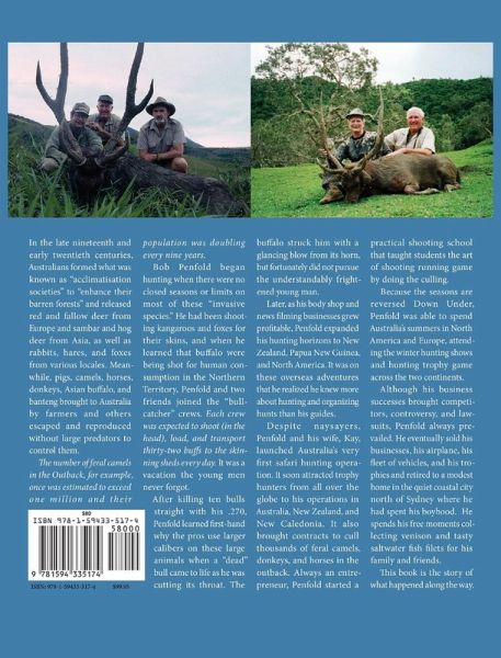 In the late nineteenth and early twentieth centuries, Australians formed what was known as "acclimatisation societies" to "enhance their barren forests" and released red and fallow deer from Europe and sambar and hog deer fromAsia, as well as rabbits, hares, and foxes from various locales. Meanwhile, pigs, camels, horses, donkeys, Asian buffalo, and banteng brought to Australia by farmers and others escaped and reproduced without large predators to control them. The number of feral camels in the Outback, for example, once was estimated to exceed one million and their population was doubling every nine years. Bob Penfold began hunting when there were no closed seasons or limits on most of these "invasive species." He had been shooting kangaroos and foxes for their skins, and when he learned that buffalo were being shot for human consumption in the Northern Territory, Penfold and two friends joined the "bullcatcher" crews. Each crew was expected to shoot (in the head), load, and transport thirty-two buffs to the skinning sheds every day. It was a vacation the young men never forgot. After killing ten bulls straight with his .270, Penfold learned first-hand why the pros use larger calibers on these large animals when a "dead" bull came to life as he was cutting its throat. The buffalo struck him with glancing blow from its horn, but fortunately did not pursue the understandably frightened young man. Later, as his body shop and news filming businesses grew profitable, Penfold expanded his hunting horizons to New Zealand, Papua New Guinea, and North America. It was on these overseas adventures that he realized he knew more about hunting and organizing hunts than his guides. Despite naysayers, Penfold and his wife, Kay, launched Australia's very first safari hunting operation. It soon attracted trophy hunters from all over the globe to his operations in Australia, New Zealand, and New Caledonia. It also brought contracts to cull thousands of feral camels, donkeys, and horses in the outback. Always an entrepreneur, Penfold started a practical shooting school that taught students the art of shooting running game by doing the culling. Because the seasons are reversed Down Under, Penfold was able to spend Australia's summers in North America and Europe, attending the winter hunting shows and hunting trophy game across the two continents. Although his business successes brought competitors, controversy, and lawsuits, Penfold always prevailed. He eventually sold his businesses, his airplane, his fleet of vehicles, and his trophies and retired to a modest home in the quiet coastal city north of Sydney where he had spent his boyhood. He spends his free moments collecting venison and tasty saltwater fish filets for his family and friends. This book is the story of what happened along the way.