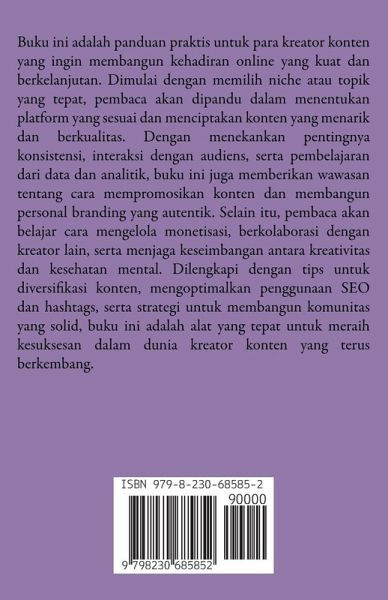 Buku ini adalah panduan praktis untuk para kreator konten yang ingin membangun kehadiran online yang kuat dan berkelanjutan. Dimulai dengan memilih niche atau topik yang tepat, pembaca akan dipandu dalam menentukan platform yang sesuai dan menciptakan konten yang menarik dan berkualitas. Dengan menekankan pentingnya konsistensi, interaksi dengan audiens, serta pembelajaran dari data dan analitik, buku ini juga memberikan wawasan tentang cara mempromosikan konten dan membangun personal branding yang autentik. Selain itu, pembaca akan belajar cara mengelola monetisasi, berkolaborasi dengan kreator lain, serta menjaga keseimbangan antara kreativitas dan kesehatan mental. Dilengkapi dengan tips untuk diversifikasi konten, mengoptimalkan penggunaan SEO dan hashtags, serta strategi untuk membangun komunitas yang solid, buku ini adalah alat yang tepat untuk meraih kesuksesan dalam dunia kreator konten yang terus berkembang.