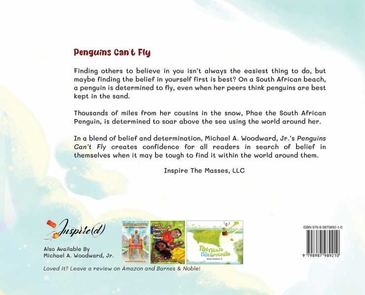Finding others to believe in you isn't always the easiest thing to do, but maybe finding the belief in yourself first is best? On a South African beach, a penguin is determined to fly, even when her peers think penguins are best kept in the sand. Thousands of miles from her cousins in the snow, Phae the South African Penguin, is determined to soar above the sea using the world around her. In a blend of belief and determination, Michael A. Woodward, Jr.'s Penguins Can't Fly creates confidence for all readers in search of belief in themselves when it may be tough to find it within the world around them.