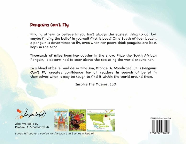 Finding others to believe in you isn't always the easiest thing to do, but maybe finding the belief in yourself first is best? On a South African beach, a penguin is determined to fly, even when her peers think penguins are best kept in the sand. Thousands of miles from her cousins in the snow, Phae the South African Penguin, is determined to soar above the sea using the world around her. In a blend of belief and determination, Michael A. Woodward, Jr.'s Penguins Can't Fly creates confidence for all readers in search of belief in themselves when it may be tough to find it within the world around them.