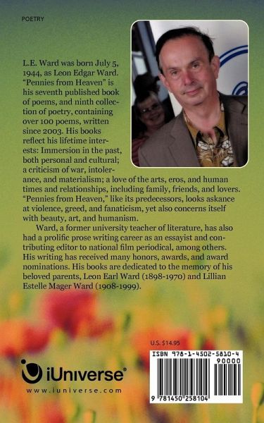 L.E. Ward was born July 5, 1944, as Leon Edgar Ward. "Pennies from Heaven" is his seventh published book of poems, and ninth collection of poetry, containing over 100 poems, written since 2003. His books reflect his lifetime interests: Immersion in the past, both personal and cultural; a criticism of war, intolerance, and materialism; a love of the arts, eros, and human times and relationships, including family, friends, and lovers. "Pennies from Heaven," like its predecessors, looks askance at violence, greed, and fanaticism, yet also concerns itself with beauty, art, and humanism. Ward, a former university teacher of literature, has also had a prolific prose writing career as an essayist and contributing editor to national film periodical, among others. His writing has received many honors, awards, and award nominations. His books are dedicated to the memory of his beloved parents, Leon Earl Ward (1898-1970) and Lillian Estelle Mager Ward (1908-1999).