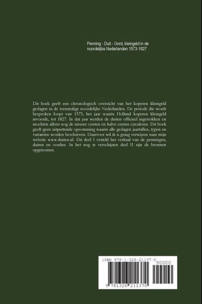 Dit boek geeft een chronologisch overzicht van het koperen kleingeld geslagen in de toenmalige noordelijke Nederlanden. De periode die wordt besproken loopt van 1573, het jaar waarin Holland koperen kleingeld invoerde, tot 1827. In dat jaar werden de duiten officieel ingetrokken en mochten alleen nog de nieuwe centen en halve centen circuleren. Dit boek geeft geen uitputtende opsomming waarin alle geslagen jaartallen, typen en varianten worden beschreven. Daarvoor wil ik u graag verwijzen naar mijn website www.duiten.nl. Dit deel I verteld het verhaal van de penningen, duiten en oorden. In het nog te verschijnen deel II zijn de bronnen opgenomen.