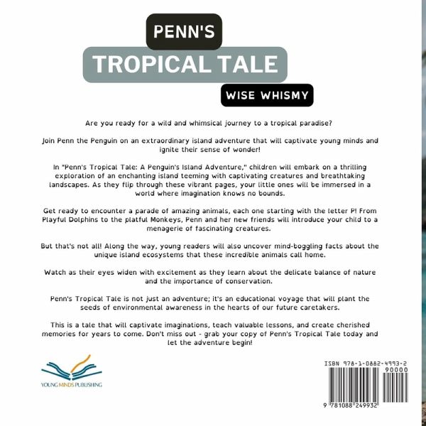 Are you ready for a wild and whimsical journey to a tropical paradise? Join Penn the Penguin on an extraordinary island adventure that will captivate young minds and ignite their sense of wonder! In "Penn's Tropical Tale: A Penguin's Island Adventure," children will embark on a thrilling exploration of an enchanting island teeming with captivating creatures and breathtaking landscapes. As they flip through these vibrant pages, your little ones will be immersed in a world where imagination knows no bounds. Get ready to encounter a parade of amazing animals, each one starting with the letter P! From Playful Dolphins to the platful Monkeys, Penn and her new friends will introduce your child to a menagerie of fascinating creatures. But that's not all! Along the way, young readers will also uncover mind-boggling facts about the unique island ecosystems that these incredible animals call home. Watch as their eyes widen with excitement as they learn about the delicate balance of nature and the importance of conservation. Penn's Tropical Tale is not just an adventure; it's an educational voyage that will plant the seeds of environmental awareness in the hearts of our future caretakers. Filled with stunning illustrations that transport readers to this magical island, this enchanting tale will spark your child's curiosity and spark their imagination. With every turn of the page, they will be inspired to dream big, explore the unknown, and appreciate the incredible beauty of our natural world. Penn's Tropical Tale: A Penguin's Island Adventure is the perfect addition to any child's library. This captivating book is designed to engage young minds, entertain curious souls, and leave a lasting impression. Whether it's bedtime stories, playtime adventures, or a rainy day escape, this delightful tale will keep your little ones entertained for hours on end. Get ready to embark on an unforgettable journey with Penn and her newfound friends. This is a tale that will captivate imaginations, teach valuable lessons, and create cherished memories for years to come. Don't miss out - grab your copy of Penn's Tropical Tale today and let the adventure begin!