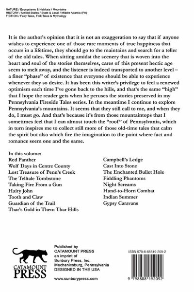It is the author's opinion that it is not an exaggeration to say that if anyone wishes to experience one of those rare moments of true happiness that occurs in a lifetime, they should go to the maintains and search for a teller of the old tales. When sitting amidst the scenery that is woven into the heart and soul of the stories themselves, cares of this present hectic age seem to melt away, and the listener is indeed transported to another level - a finer "phase" of existence that everyone should be able to experience whenever they so desire. It has been this writer's privilege to feel a renewed optimism each time I've gone back to the hills, and that's the same "high" that I hope the reader gets when he peruses the stories preserved in my Pennsylvania Fireside Tales series. In the meantime I continue to explore Pennsylvania's mountains. It seems that they still call to me, and when they do, I must go. And that's because it's from those mountaintops that I sometimes feel that I can almost touch the "roof" of Pennsylvania, which in turn inspires me to collect still more of those old-time tales that calm the spirit but also which fire the imagination to the point where fact and romance seem one and the same. In this volume: Red Panther Wolf Days in Centre County Lost Treasure of Penn's Creek The Telltale Tombstone Taking Fire From a Gun Hairy John Tooth and Claw Guardian of the Trail Thar's Gold in Them Thar Hills Campbell's Ledge Cast Into Stone The Enchanted Bullet Hole Fiddling Phantoms Night Screams Hand-to-Horn Combat Indian Summer Gypsy Caravans