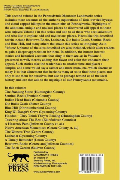 This second volume in the Pennsylvania Mountain Landmarks series includes more accounts of the author's explorations of little-traveled byways and cloud-capped hilltops in the mountains of Pennsylvania. Highlights of the additional unique and unusual places he discovered will appeal to those who enjoyed Volume 1 in this series and also to all those who seek adventure and who like to explore odd and mysterious places. Places like this described herein include Beartown Rocks, Lochabar, Ole Bull's Castle, Sentinel Rock, and Blue Hill, and many others that make this series so intriguing. As in Volume 1, photos of the sites described are also included, which allow readers to gain a deeper appreciation for them. In addition, the human interest stories and historical accounts that cling to them are, as in Volume 1, presented as well, thereby adding that flavor and color that enhances their appeal. Such stories take the reader back to another time and place; a simpler, and some would say a calmer and more moral era, which charms us today. It is that allurement that beckons many of us to find these places; not only to see them for ourselves, but also to perhaps remind us of the local history and lore that add to the mystique of our Pennsylvania mountains. In this volume:The Standing Stone (Huntingdon County) Sentinel Rock (Franklin County) Indian Head Rock (Columbia County) Ole Bull's Castle (Potter County) Blue Hill (Northumberland County) King Wi-Daagh's Grave (Lycoming County) Hoodoo - They Think They're Fooling (Huntingdon County) Towering Above The Rest (Elk/Sullivan Counties) A Heavenly Path (Jefferson County et. al.) Native American Mementoes (Centre County et. al.) The Witness Tree (Centre County) Lochabar (Lycoming County) A Timely Reminder (Union County) Beartown Rocks (Centre and Jefferson Counties) The Rock Garden (Sullivan County)