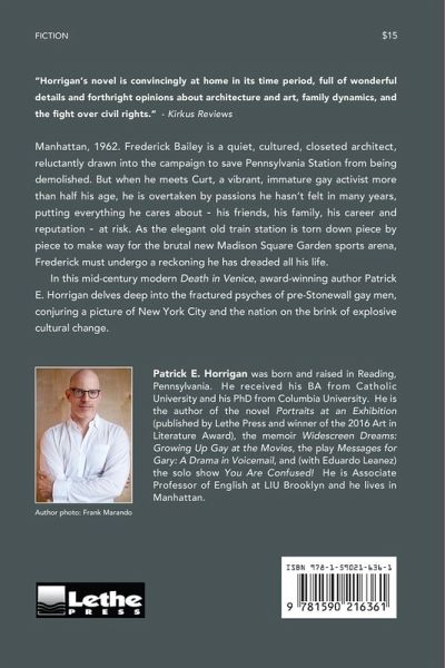 Manhattan,1962. Frederick Bailey is a quiet, cultured, closeted architect reluctantly drawn into the effort to save Pennsylvania Station from being demolished. But when he meets Curt, a vibrant, immature gay activist more than half his age, he is overtaken by passions he hasn’t felt in years, putting everything he cares about—his friends, his family, his career and reputation—at risk. As the elegant old train station is dismantled piece by piece to make way for the crass new Madison Square Garden sports arena, Frederick must undergo a reckoning he has dreaded all his life. Award-winning author Patrick E. Horrigan delves into the fractured psyches of mid-twentieth-century gay men, conjuring a picture of New York City and the nation on the brink of explosive cultural change.