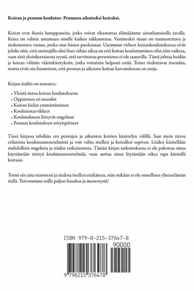 Koiran ja pennun koulutus: Pennusta aikuiseksi koiraksi. Koirat ovat ihania kumppaneita, jotka voivat rikastuttaa elämäämme ainutlaatuisella tavalla. Koira on valmis antamaan sinulle kaiken rakkautensa. Vastineeksi sinun on tunnustettava ja tiedostettava vastuu, jonka otat hänen puolestaan. Useimmat virheet koirankoulutuksessa eivät johdu siitä, että omistajilla olisi liian vähän aikaa tai että koiran kouluttaminen olisi niin vaikeaa, vaan siitä yksinkertaisesta syystä, että tarvittavaa perustietoa ei ole saatavilla. Tämä johtaa heidän ja koiran välisiin väärinkäsityksiin, jotka voitaisiin helposti estää. Toiset tiedottavat itsestään, mutta eivät ota huomioon, että pennun ja aikuisen koiran kasvatuksessa on eroja. Kirjan sisältö on seuraava:Yleistä tietoa koiran koulutuksesta Oppimisen eri muodot Koiran kielen ymmärtäminen Koulutustarvikkeet Koulutukseen liittyvät ongelmat Pennun koulutuksen erityispiirteet Tässä kirjassa tehdään ero pentujen ja aikuisten koirien käsittelyn välillä. Saat myös tietoa erilaisista koulutusmenetelmistä ja voit valita itsellesi ja koirallesi sopivan. Lisäksi käsitellään mahdollisia ongelmia ja niiden ratkaisemista. Tämän kirjan tarkoituksena ei ole pakottaa sinua käyttämään tiettyä koulutusmenetelmää, vaan auttaa sinua löytämään oikea tapa käsitellä koiraasi. Toimi siis aina tietoisesti ja tiedota itsellesi etukäteen, niin mikään ei ole onnellisen yhteiselämän tiellä. Toivotamme teille paljon hauskaa ja menestystä!