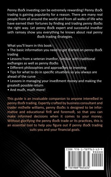 Penny stock investing can be extremely rewarding! Penny stock trading is gaining popularity for a reason. There are many real people from all around the world and from all walks of life who have earned their fortunes by finding and trading penny stocks the right way. Let penny stock expert and successful investor seth ramsey show you everything he knows about real penny stock trading strategies. What you'll learn in this book: ¿ The basic information you need to get started on penny stock trading ¿ Lessons from a veteran investor, familiar with traditional exchanges as well as penny stocks ¿ Different philosophies and approaches to investing ¿ Tips for what to do in specific situations so you always are ahead of the curve ¿ Lessons in managing your investment money and making the greatest possible return ¿ And much, much more! This guide is an invaluable companion to anyone interested in penny stock trading. Expertly crafted by business consultant and trader michelle williams, penny stocks is designed to be informative and educational first and foremost, so that you can make informed decisions when it comes to your money. Without glorifying the penny stock trade or its practices, this is an essential tool to help you figure out if penny stock trading suits you and your financial goals.