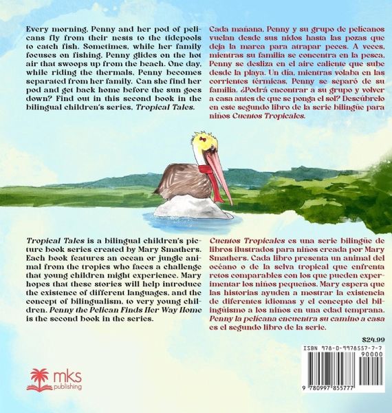 Every morning, Penny and her pod of pelicans fly from their nests to the tidepools to catch fish. Sometimes, while her family focuses on fishing, Penny glides on the hot air that swoops up from the beach. One day, while riding the thermals, Penny becomes separated from her family. Can she find her pod and get back home before the sun goes down? Find out in this second book in the bilingual children's series, Tropical Tales. Cada mañana, Penny y su grupo de pelícanos vuelan desde sus nidos hasta las pozas que deja la marea para atrapar peces. A veces, mientras su familia se concentra en la pesca, Penny se desliza en el aire caliente que sube desde la playa. Un día, mientras volaba en las corrientes térmicas, Penny se separa de su familia. ¿Podrá encontrar su grupo y volver a casa antes de que se ponga el sol? Descúbrelo en este segundo libro de la serie bilingüe para niños, Cuentos tropicales.
