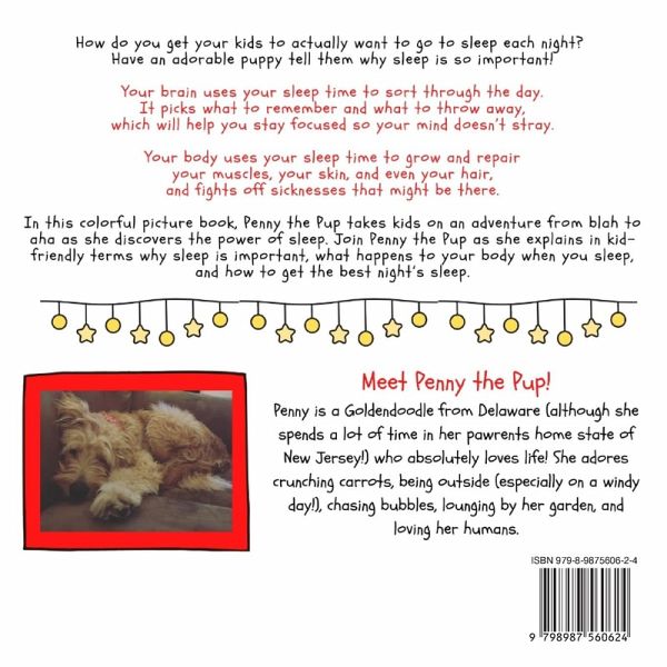 How do you get your kids to actually want to go to sleep each night? Have an adorable puppy tell them why sleep is so important! In this colorful picture book, Penny the Pup takes kids on an adventure from blah to aha as she discovers the power of sleep. Join Penny the Pup as she explains in kid-friendly terms why sleep is important, what happens to your body when you sleep, and how to get the best night's sleep. Your brain uses your sleep time to sort through the day. It picks what to remember and what to throw away, which will help you stay focused so your mind doesn't stray. Your body uses your sleep time to grow and repair your muscles, your skin, and even your hair, and fights off sicknesses that might be there. This book hits so many things that make kids fall in love with books - it has real information, endearing illustrations, and rhyming text - and it gives parents, educators, and medical professionals the much-needed stepping stone to address one of the most influential factors of good health.