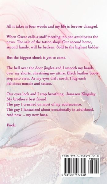 All it takes is four words and my life is forever changed. When Oscar calls a staff meeting, no one anticipates the news. The sale of the tattoo shop. Our second home, second family, will be broken. Sold to the highest bidder. But the biggest shock is yet to come. The bell over the door jingles and I smooth my hands over my shorts, chastising my attire. Black leather boots step into view. As my eyes drift north, I log each delicious muscle and tattoo. Our eyes lock and I stop breathing. Jameson Kingsley. My brother's best friend. The guy I crushed on most of my adolescence. The guy I fantasized about occasionally in adulthood. And now... my new boss. F*ck.