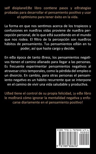 Este libro contiene pasos y estrategias probadas para desarrollar el pensamiento positivo y usar el optimismo para tener éxito en la vida. La forma en que nos sentimos acerca de los tropiezos y confusiones en nuestras vidas proviene de nuestra percepción personal, de lo que está sucediendo en el mundo que nos rodea. El filtro de la percepción son nuestros hábitos de pensamiento. Tus pensamientos están en tu poder, así que hazte cargo y decide. En esta época de tanto stress, los pensamientos negativos tienen el camino allanado para llegar a las personas. Es frecuente experimentar pensamientos negativos al atravesar crisis temporales, como la pérdida del empleo o un divorcio. En cambio, para otras personas el pensamiento negativo es un hábito recurrente que se interpone en el camino de vivir una vida saludable y productiva. Usted tiene el control de su propia felicidad, ¡y este libro le mostrará cómo ignorar la mentalidad negativa y enfocarse diariamente en el pensamiento positivo!