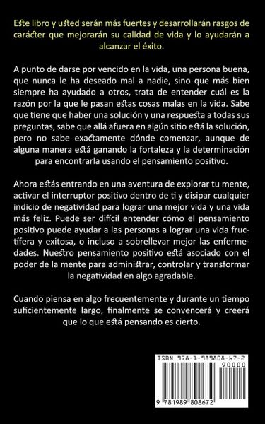 Este libro y usted serán más fuertes y desarrollarán rasgos de carácter que mejorarán su calidad de vida y lo ayudarán a alcanzar el éxito. A punto de darse por vencido en la vida, una persona buena, que nunca le ha deseado mal a nadie, sino que más bien siempre ha ayudado a otros, trata de entender cuál es la razón por la que le pasan estas cosas malas en la vida. Sabe que tiene que haber una solución y una respuesta a todas sus preguntas, sabe que allá afuera en algún sitio está la solución, pero no sabe exactamente dónde comenzar, aunque de alguna manera está ganando la fortaleza y la determinación para encontrarla usando el pensamiento positivo. Ahora estás entrando en una aventura de explorar tu mente, activar el interruptor positivo dentro de ti y disipar cualquier indicio de negatividad para lograr una mejor vida y una vida más feliz. Puede ser difícil entender cómo el pensamiento positivo puede ayudar a las personas a lograr una vida fructífera y exitosa, o incluso a sobrellevar mejor las enfermedades. Nuestro pensamiento positivo está asociado con el poder de la mente para administrar, controlar y transformar la negatividad en algo agradable. Cuando piensa en algo frecuentemente y durante un tiempo suficientemente largo, finalmente se convencerá y creerá que lo que está pensando es cierto.