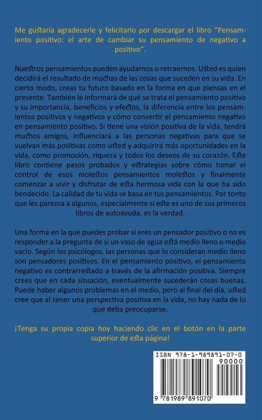 Me gustaría agradecerle y felicitarlo por descargar el libro "Pensamiento positivo: el arte de cambiar su pensamiento de negativo a positivo". Nuestros pensamientos pueden ayudarnos o retraernos. Usted es quien decidirá el resultado de muchas de las cosas que suceden en su vida. En cierto modo, creas tu futuro basado en la forma en que piensas en el presente. También le informará de qué se trata el pensamiento positivo y su importancia, beneficios y efectos, la diferencia entre los pensamientos positivos y negativos y cómo convertir el pensamiento negativo en pensamiento positivo. Si tiene una visión positiva de la vida, tendrá muchos amigos, influenciará a las personas negativas para que se vuelvan más positivas como usted y adquirirá más oportunidades en la vida, como promoción, riqueza y todos los deseos de su corazón. Este libro contiene pasos probados y estrategias sobre cómo tomar el control de esos molestos pensamientos molestos y finalmente comenzar a vivir y disfrutar de esta hermosa vida con la que ha sido bendecido. La calidad de tu vida se basa en tus pensamientos. Por tonto que les parezca a algunos, especialmente si este es uno de sus primeros libros de autoayuda, es la verdad. Una forma en la que puedes probar si eres un pensador positivo o no es responder a la pregunta de si un vaso de agua está medio lleno o medio vacío. Según los psicólogos, las personas que lo consideran medio lleno son pensadores positivos. En el pensamiento positivo, el pensamiento negativo es contrarrestado a través de la afirmación positiva. Siempre crees que en cada situación, eventualmente sucederán cosas buenas. Puede haber algunos problemas en el medio, pero al final del día, usted cree que al tener una perspectiva positiva en la vida, no hay nada de lo que deba preocuparse. ¡Tenga su propia copia hoy haciendo clic en el botón en la parte superior de esta página!