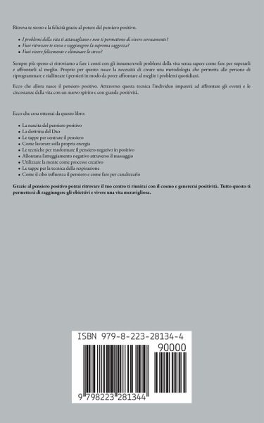 Ritrova te stesso e la felicità grazie al potere del pensiero positivo.I problemi della vita ti attanagliano e non ti permettono di vivere serenamente? Vuoi ritrovare te stesso e raggiungere la suprema saggezza? Vuoi vivere felicemente e eliminare lo stress? Sempre più spesso ci ritroviamo a fare i conti con gli innumerevoli problemi della vita senza sapere come fare per superarli e affrontarli al meglio. Proprio per questo nasce la necessità di creare una metodologia che permetta alle persone di riprogrammare e riallineare i pensieri in modo da poter affrontare al meglio i problemi quotidiani. Ecco che allora nasce il pensiero positivo. Attraverso questa tecnica l'individuo imparerà ad affrontare gli eventi e le circostanze della vita con un nuovo spirito e con grande positività. Ecco che cosa otterrai da questo libro:La nascita del pensiero positivo La dottrina del Dao Le tappe per centrare il pensiero Come lavorare sulla propria energia Le tecniche per trasformare il pensiero negativo in positivo Allontana l'atteggiamento negativo attraverso il massaggio Utilizzare la mente come processo creativo Le tappe per la tecnica della respirazione Come il cibo influenza il pensiero e come fare per canalizzarlo Grazie al pensiero positivo potrai ritrovare il tuo centro ti riunirai con il cosmo e genererai positività. Tutto questo ti permetterà di raggiungere gli obiettivi e vivere una vita meravigliosa.