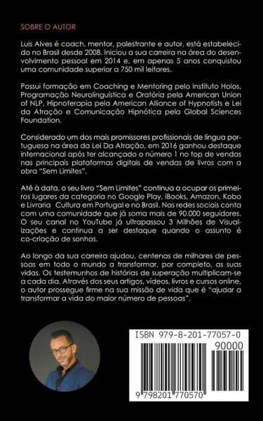 PORTUGUÊS: Luis Alves é Coach, Mentor, Palestrante e Autor. É especialista em Sucesso e Lei da Atração. Possui 11 livros publicados dos quais se destaca o best-seller internacional "Sem Limites - O Guia Para Atrair Riqueza, Prosperidade e Abundância" que ocupa frequentemente o número 1 de vendas da sua categoria no Google Play, iTunes e Amazon. Na lista dos seus livros mais vendidos destacam-se também as obras: "A Matriz Do Sucesso", "Pense Positivo", "Inspiração Para A Vida", "Como Melhorar A Sua Comunicação" e "Ser Feliz É Possível". A sua obra mais recente é o livro "Os Segredos De Um Casamento De Sucesso". É formado em Coaching e Mentoring pelo Instituto Holos, Programação Neurolinguística e Oratória pela American Union of NLP, Hipnoterapia pela American Alliance of Hypnotists e Lei da Atração e Comunicação Hipnótica pela Global Sciences Foundation. Considerado um dos mais promissores profissionais na área do desenvolvimento humano em língua portuguesa, o Autor conta com uma comunidade de mais de 500.000 leitores em todo o mundo. ENGLISH: Luis Alves is a Coach, Mentor, Speaker and Author. Expert in Success and in the Law of Attraction. He has 12 books published including the international best-seller "Sem Limites – O Guia Para Atrair Riqueza, Prosperidade e Abundância" which often ranks number 1 in sales in its category in Google Play, iTunes and Amazon. Graduated in Coaching and Mentoring by the Holos Institute, Neuro-Linguistic Programming and Public Speaking by the American Union of NLP, Hypnotherapy by the American Alliance of Hypnotists and Law of Attraction and Hypnotic Communication by the Global Sciences Foundation. Considered one of the most promising professionals in the area of personal development in Portuguese language, the author has a community with over 500,000 readers worldwide.