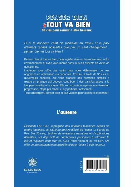 Et si le bonheur, l'état de plénitude au travail et la paix n'étaient rendus possibles que par un seul changement: penser bien et tout va bien ? Penser bien et tout va bien, cela signifie vivre en harmonie avec votre environnement et avec vous-même dans tous les aspects de votre vie quotidienne. L'auteure vous offre des outils pour vous débarrasser de vos angoisses en optimisant vos capacités. Ensuite, à l'aide de 30 clés et d'exemples concrets, elle vous propose des exercices simples à mettre en pratique qui peuvent contribuer à des transformations à la fois personnelles et sociales. Elle vous convie à explorer une évolution progressive, étape par étape, et à y participer activement. Tout simplement, penser bien et tout va bien pour atteindre le bonheur.