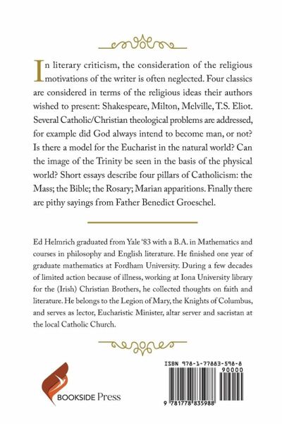 In literary criticism, the consideration of the religious motivations of the writer is often neglected. Four classics are considered in terms of the religious ideas their authors wished to present: Shakespeare, Milton, Melville, T.S. Eliot. Several Catholic/Christian theological problems are addressed, for example did God always intend to become man, or not? Is there a model for the Eucharist in the natural world? Can the image of the Trinity be seen in the basis of the physical world? Short essays describe four pillars of Catholicism: the Mass; the Bible; the Rosary; Marian apparitions. Finally there are pithy sayings from Father Benedict Groeschel.