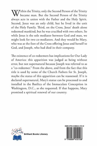 Within the Trinity, only the Second Person of the Trinity became man. But the Second Person of the Trinity always acts in union with the Father and the Holy Spirit. Second, Jesus was an only child, but he lived in the unit of the Holy Family. Third, on the Cross, Jesus' death alone redeemed mankind, but he was crucified with two others. So while Jesus is the sole mediator between God and man, we might look for two co-mediators. And they would be Mary, who was at the foot of the Cross offering Jesus and herself to God, and Joseph, who had died in their company. The existence of co-redeemers has implications for Our Lady of America: this apparition was judged as being without error, but not supernatural because Joseph was referred to as a "co-redeemer." From the above, and from the fact that this title is used by some of the Church Fathers for St. Joseph, maybe the status of this apparition can be reassessed. If it is declared supernatural, Mary's statue can be processed to and installed in the Basilica of the Immaculate Conception in Washington, D.C., as she requested. If that happens, Mary promised a spiritual renewal of our country.