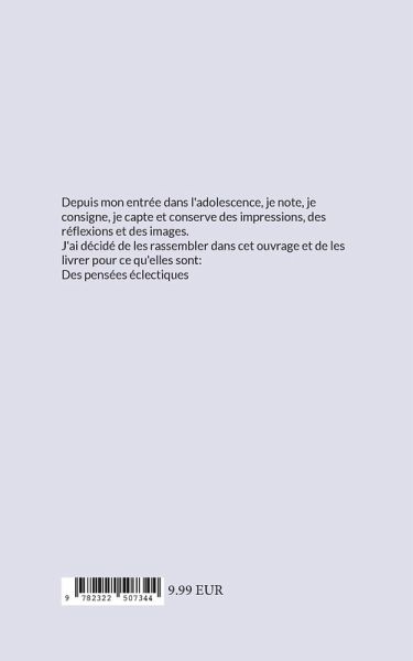 Depuis mon entrée dans l'adolescence, je note, je consigne, je capte et conserve des impressions, des réflexions et des images.J'ai décidé de les rassembler dans cet ouvrage et de les livrer pour ce qu'elles sont: Des pensées éclectiques