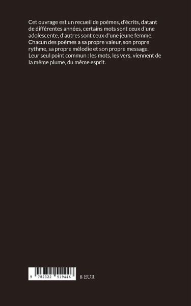 Cet ouvrage est un recueil de poèmes, d'écrits, datant de différentes années, certains mots sont ceux d'une adolescente, d'autres sont ceux d'une jeune femme. Chacun des poèmes a sa propre valeur, son propre rythme, sa propre mélodie et son propre message. Leur seul point commun : les mots, les vers, viennent de la même plume, du même esprit.