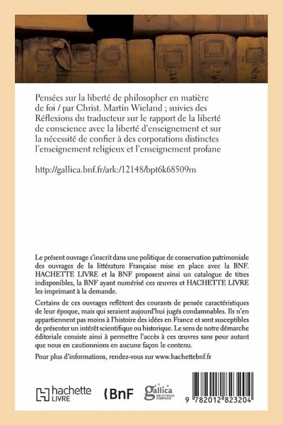 Pensees sur la liberte de philosopher en matiere de foi / par Christ. Martin Wieland; suivies des Reflexions du traducteur sur le rapport de la liberte de conscience avec la liberte d'enseignement et sur la necessite de confier a des corporations distinctes l'enseignement religieux et l'enseignement profaneDate de l'edition originale: 1844Ce livre est la reproduction fidele d'une oeuvre publiee avant 1920 et fait partie d'une collection de livres reimprimes a la demande editee par Hachette Livre, dans le cadre d'un partenariat avec la Bibliotheque nationale de France, offrant l'opportunite d'acceder a des ouvrages anciens et souvent rares issus des fonds patrimoniaux de la BnF.Les oeuvres faisant partie de cette collection ont ete numerisees par la BnF et sont presentes sur Gallica, sa bibliotheque numerique.En entreprenant de redonner vie a ces ouvrages au travers d'une collection de livres reimprimes a la demande, nous leur donnons la possibilite de rencontrer un public elargi et participons a la transmission de connaissances et de savoirs parfois difficilement accessibles.Nous avons cherche a concilier la reproduction fidele d'un livre ancien a partir de sa version numerisee avec le souci d'un confort de lecture optimal. Nous esperons que les ouvrages de cette nouvelle collection vous apporteront entiere satisfaction.Pour plus d'informations, rendez-vous sur www.hachettebnf.frhttp: //gallica.bnf.fr/ark: /12148/bpt6k68509m