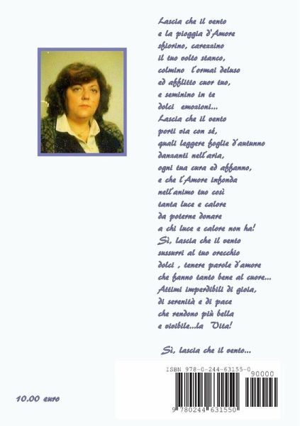 IRDA EDIZIONI Per Mimma Pascazio la poesia è magia che sovrasta il tempo e si manifesta mediante l'amore, la speranza, la vita. La poetessa, nei suoi versi, ci parla di un'interiorità forte, intensa, forgiata dalle dure prove affrontate lungo il cammino. L'amore raccontato diviene sogno e speranza, ma anche canto, melodia, che esprime con determinazione il desiderio di andare avanti, scavalcando la tristezza e le difficili prove che il destino le ha riservato. Le sue poesie ci regalano "dipinti": la bellezza del cielo mattutino con i suoi colori chiari dalle mille sfumature; la dolce melodia degli uccelli che, a primavera, cinguettano gioiosi, ringraziando il mondo per le bellezze in esso custodite; l'incanto nell'osservare la semplicità di un fiore, il silenzioso pianto della rugiada e l'inebriante odore del mare. I suoi versi inneggiano la natura, ma sono anche testimonianza dell'importante legame famigliare con i suoi figli, Tiziana e Roberto, e del prezioso ricordo della madre...