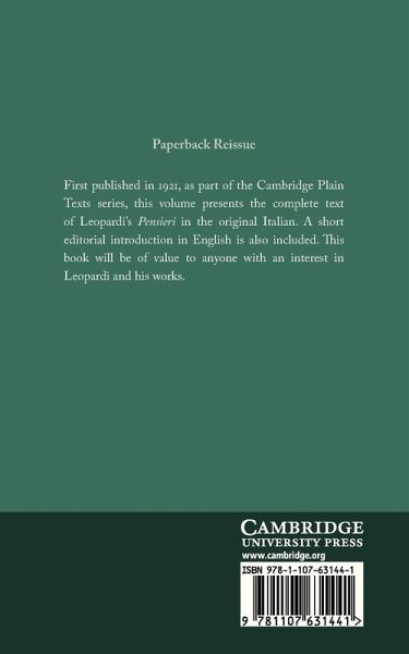 First published in 1921, as part of the Cambridge Plain Texts series, this volume presents the complete text of Leopardi's Pensieri in the original Italian. A short editorial introduction in English is also included. This book will be of value to anyone with an interest in Leopardi and his works.