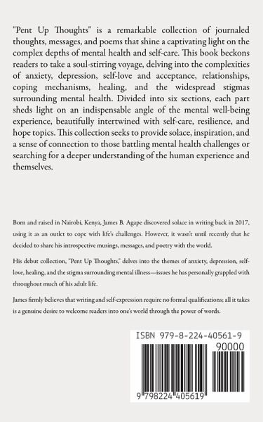 Born and raised in Nairobi, Kenya, James B. Agape discovered solace in writing back in 2017, using it as an outlet to cope with life's challenges. However, it wasn't until recently that he decided to share his introspective musings, messages, and poetry with the world. His debut collection, "Pent Up Thoughts," delves into the themes of anxiety, depression, self-love, healing, and the stigma surrounding mental illness-issues he has personally grappled with throughout much of his adult life. James firmly believes that writing and self-expression require no formal qualifications; all it takes is a genuine desire to welcome readers into one's world through the power of words.