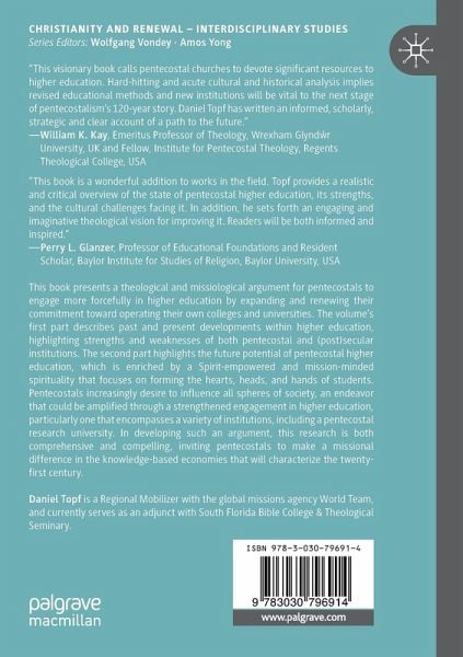This book presents a theological and missiological argument for pentecostals to engage more forcefully in higher education by expanding and renewing their commitment toward operating their own colleges and universities. The volume's first part describes past and present developments within higher education, highlighting strengths and weaknesses of both pentecostal and (post)secular institutions. The second part highlights the future potential of pentecostal higher education, which is enriched by a Spirit-empowered and mission-minded spirituality that focuses on forming the hearts, heads, and hands of students. Pentecostals increasingly desire to influence all spheres of society, an endeavor that could be amplified through a strengthened engagement in higher education, particularly one that encompasses a variety of institutions, including a pentecostal research university. In developing such an argument, this research is both comprehensive and compelling, inviting pentecostalsto make a missional difference in the knowledge-based economies that will characterize the twenty-first century.