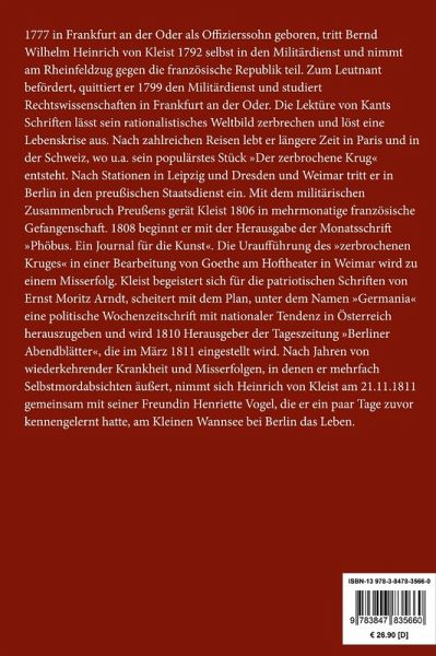 Heinrich von Kleist: Penthesilea. Ein Trauerspiel Lesefreundlicher Großdruck in 16-pt-Schrift Großformat, 210 x 297 mm Berliner Ausgabe, 2019 Durchgesehener Neusatz mit einer Biographie des Autors bearbeitet und eingerichtet von Theodor Borken Entstanden 1806/07, Teildruck in: Phöbus (Dresden) 1. Jg., 1808, 1. Stück; Erstdruck: Tübingen (Cotta) 1808. Erste Aufführung einer Bearbeitung im Mai 1876 in Berlin. Erste Aufführung des Originaltextes erst 1892 in München. Textgrundlage ist die Ausgabe: Heinrich von Kleist: Werke und Briefe in vier Bänden. Herausgegeben von Siegfried Streller in Zusammenarbeit mit Peter Goldammer und Wolfgang Barthel, Anita Golz, Rudolf Loch, Berlin und Weimar: Aufbau, 1978. Umschlaggestaltung von Thomas Schultz-Overhage unter Verwendung des Bildes: Johann Heinrich Wilhelm Tischbein, Achill und Penthesilea, um 1823. Gesetzt aus der Minion Pro, 16 pt. Über den Autor: 1777 in Frankfurt an der Oder als Offizierssohn geboren, tritt Bernd Wilhelm Heinrich von Kleist 1792 selbst in den Militärdienst und nimmt am Rheinfeldzug gegen die französische Republik teil. Zum Leutnant befördert, quittiert er 1799 den Militärdienst und studiert Rechtswissenschaften in Frankfurt an der Oder. Die Lektüre von Kants Schriften lässt sein rationalistisches Weltbild zerbrechen und löst eine Lebenskrise aus. Nach zahlreichen Reisen lebt er längere Zeit in Paris und in der Schweiz, wo u.a. sein populärstes Stück »Der zerbrochene Krug« entsteht. Nach Stationen in Leipzig und Dresden und Weimar tritt er in Berlin in den preußischen Staatsdienst ein. Mit dem militärischen Zusammenbruch Preußens gerät Kleist 1806 in mehrmonatige französische Gefangenschaft. 1808 beginnt er mit der Herausgabe der Monatsschrift »Phöbus. Ein Journal für die Kunst«. Die Uraufführung des »zerbrochenen Kruges« in einer Bearbeitung von Goethe am Hoftheater in Weimar wird zu einem Misserfolg. Kleist begeistert sich für die patriotischen Schriften von Ernst Moritz Arndt, scheitert mit dem Plan, unter dem Namen »Germania« eine politische Wochenzeitschrift mit nationaler Tendenz in Österreich herauszugeben und wird 1810 Herausgeber der Tageszeitung »Berliner Abendblätter«, die im März 1811 eingestellt wird. Nach Jahren von wiederkehrender Krankheit und Misserfolgen, in denen er mehrfach Selbstmordabsichten äußert, nimmt sich Heinrich von Kleist am 21.11.1811 gemeinsam mit seiner Freundin Henriette Vogel, die er ein paar Tage zuvor kennengelernt hatte, am Kleinen Wannsee bei Berlin das Leben.