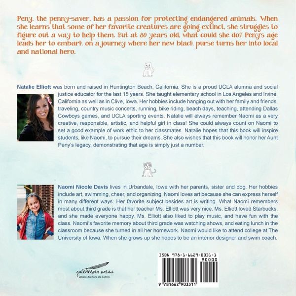 Peny, the penny-saver, has a passion for protecting endangered animals. When she learns that some of her favorite creatures are going extinct, she struggles to figure out a way to help them. But at 80 years old, what could she do? Peny's age leads her to embark on a journey where her new black purse turns her into local and national hero.