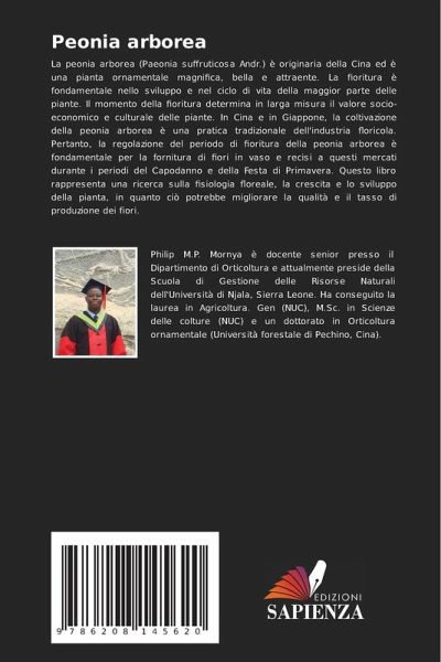 La peonia arborea (Paeonia suffruticosa Andr.) è originaria della Cina ed è una pianta ornamentale magnifica, bella e attraente. La fioritura è fondamentale nello sviluppo e nel ciclo di vita della maggior parte delle piante. Il momento della fioritura determina in larga misura il valore socio-economico e culturale delle piante. In Cina e in Giappone, la coltivazione della peonia arborea è una pratica tradizionale dell'industria floricola. Pertanto, la regolazione del periodo di fioritura della peonia arborea è fondamentale per la fornitura di fiori in vaso e recisi a questi mercati durante i periodi del Capodanno e della Festa di Primavera. Questo libro rappresenta una ricerca sulla fisiologia floreale, la crescita e lo sviluppo della pianta, in quanto ciò potrebbe migliorare la qualità e il tasso di produzione dei fiori.