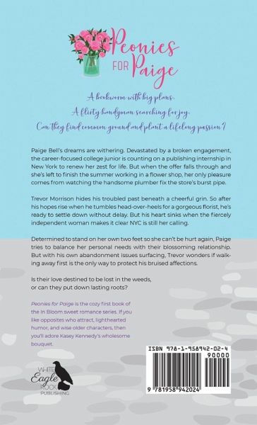 A bookworm with big plans. A flirty handyman searching for joy. Can they find common ground and plant a lifelong passion? Paige Bell's dreams are withering. Devastated by a broken engagement, the career-focused college junior is counting on a publishing internship in New York to renew her zest for life. But when the offer falls through and she's left to finish the summer working in a flower shop, her only pleasure comes from watching the handsome plumber fix the store's burst pipe. Trevor Morrison hides his troubled past beneath a cheerful grin. So after his hopes rise when he tumbles head-over-heels for a gorgeous florist, he's ready to settle down without delay. But his heart sinks when the fiercely independent woman makes it clear NYC is still her calling. Determined to stand on her own two feet so she can't be hurt again, Paige tries to balance her personal needs with their blossoming relationship. But with his own abandonment issues surfacing, Trevor wonders if walking away first is the only way to protect his bruised affections. Is their love destined to be lost in the weeds, or can they put down lasting roots? Peonies for Paige is the cozy first book of the In Bloom sweet romance series. If you like opposites who attract, lighthearted humor, and wise older characters, then you'll adore Kasey Kennedy's wholesome bouquet.