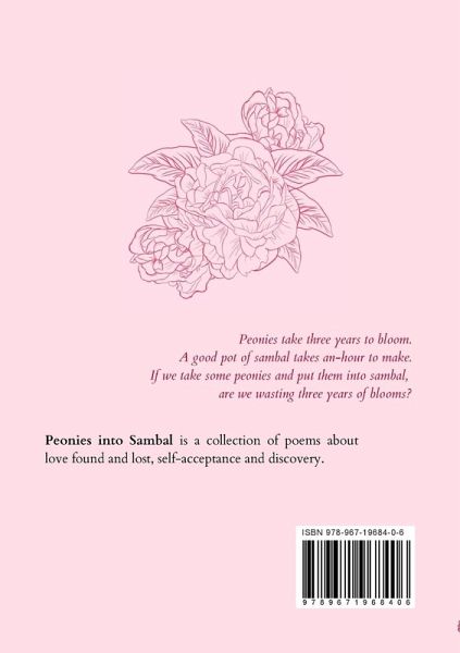 Peonies into Sambal is the second poetry collection by Phedora but the first to be debuted under her own name. Phedora penned her journey as a Malaysian of Kadazan and Chinese descent navigating adulthood. Her collection dives into the process of sambal-making by seeking to accept, process, and define the self through finding love, losing hearts, and self-exploration on what it means to find a home.