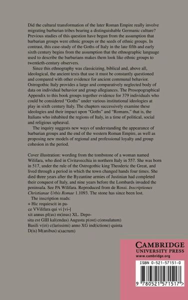 Preface; Map of Ostrogothic Italy; List of rulers; Introduction: studying the barbarians in late antiquity; 1. Ethnicity, ethnography and community in the fifth and sixth centuries; 2. The Ravenna government and ethnographic identity: from civitas to bellicositas; 3. Individual reactions to ideology. I: names, language and profession; 4. Complementary and competing ideals of community: Italy and the Roman empire; 5. Individual reactions to ideology. II: soldiers, civilians and political allegiance; 6. Catholic communities and Christian empire; 7. Individual reactions to ideology. III: Catholics and Arians; 8. The origin of the Goths and Balkan military culture; Conclusion; Appendix 1: the inquiry into Gundila's property; Appendix 2: the Germanic culture construct; Appendix 3: archaeological and toponymic research on Ostrogothic Italy; Appendix 4: dress, hairstyle and military customs; Prosopographical appendix: a prosopography of the Goths in Italy, 489-554.