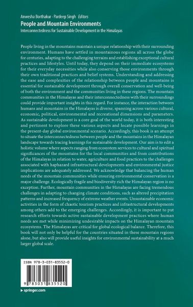 People living in the mountains maintain a unique relationship with their surrounding environment. Humans have settled in mountainous regions all across the globe for centuries, adapting to the challenging terrains and establishing exceptional cultural practices and lifestyles. Until today, they depend on their immediate ecosystems for their everyday necessities while also conserving those environments through their own traditional practices and belief systems. Understanding and addressing the ease and complexities of the relationship between people and mountains is essential for sustainable development through overall conservation and well-being of both the environment and the communities living in these regions. The mountain communities in the Himalayas and their interconnectedness with their surroundings could provide important insights in this regard. For instance, the interaction between humans and mountains in the Himalayas is diverse, spanning across various cultural, economic, political, environmental and recreational dimensions and parameters. As sustainable development is a core goal of the world today, it is both interesting and pertinent to explore these various aspects and locate possible learnings in the present-day global environmental scenario. Accordingly, this book is an attempt to situate the interconnected between people and the mountains in the Himalayan landscape towards tracing learnings for sustainable development. Our aim is to edit a holistic volume where aspects ranging from ecosystem services to cultural and spiritual significances of the mountains for the local communities and from contributions of the Himalayas in relation to water, agriculture and food practices to the challenges associated with haphazard infrastructural developments and environmental justice implications are adequately addressed. We acknowledge that balancing the human needs of the mountain communities while ensuring environmental conservation is a majorchallenge. Ecologically fragile and biodiversity rich the Himalayan region is no exception. Further, mountain communities in the Himalayas are facing tremendous challenges in adapting to changing climate conditions, such as altered precipitation patterns and increased frequency of extreme weather events. Unsustainable economic activities in the form of chaotic tourism practices and infrastructural developments among others add to the emerging challenges. Accordingly, it is important to put research efforts towards active sustainable development practices where human needs are met while minimizing undesirable impacts on the Himalayan mountain ecosystems. The Himalayas are critical for global ecological balance. Therefore, this book will not only be helpful for the countries situated in these mountain regions alone, but also will provide useful insights for environmental sustainability at a much larger global scale.