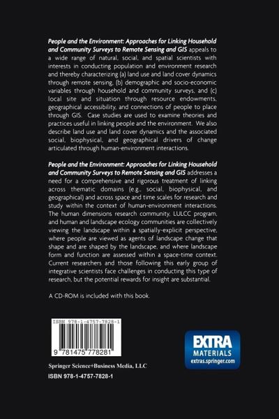 People and the Environment: Approaches for Linking Household and Community Surveys to Remote Sensing and GIS appeals to a wide range of natural, social, and spatial scientists with interests in conducting population and environment research and thereby characterizing (a) land use and land cover dynamics through remote sensing, (b) demographic and socio-economic variables through household and community surveys, and (c) local site and situation through resource endowments, geographical accessibility, and connections of people to place through GIS. Case studies are used to examine theories and practices useful in linking people and the environment. We also describe land use and land cover dynamics and the associated social, biophysical, and geographical drivers of change articulated through human-environment interactions.