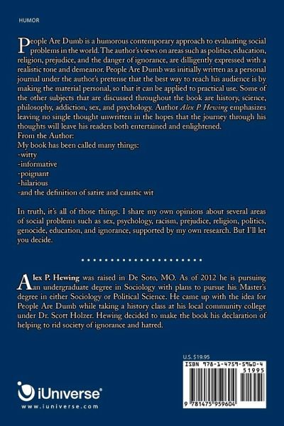 People Are Dumb is a humorous contemporary approach to evaluating social problems in the world. The author's views on areas such as politics, education, religion, prejudice, and the danger of ignorance, are dilligently expressed with a realistic tone and demeanor. People Are Dumb was initially written as a personal journal under the author's pretense that the best way to reach his audience is by making the material personal, so that it can be applied to practical use. Some of the other subjects that are discussed throughout the book are history, science, philosophy, addiction, sex, and psychology. Author Alex P. Hewing emphasizes leaving no single thought unwritten in the hopes that the journey through his thoughts will leave his readers both entertained and enlightened. From the Author: My book has been called many things: -witty -informative -poignant -hilarious -and the definition of satire and caustic wit In truth, it's all of those things. I share my own opinions about several areas of social problems such as sex, psychology, racism, prejudice, religion, politics, genocide, education, and ignorance, supported by my own research. But I'll let you decide.