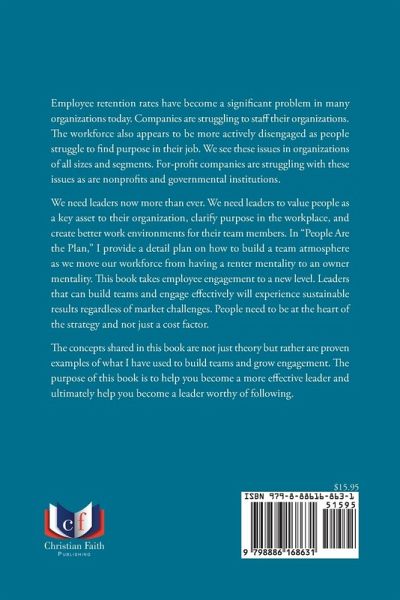 Employee retention rates have become a significant problem in many organizations today. Companies are struggling to staff their organizations. The workforce also appears to be more actively disengaged as people struggle to find purpose in their job. We see these issues in organizations of all sizes and segments. For-profit companies are struggling with these issues as are nonprofits and governmental institutions. We need leaders now more than ever. We need leaders to value people as a key asset to their organization, clarify purpose in the workplace, and create better work environments for their team members. In "People Are the Plan," I provide a detail plan on how to build a team atmosphere as we move our workforce from having a renter mentality to an owner mentality. This book takes employee engagement to a new level. Leaders that can build teams and engage effectively will experience sustainable results regardless of market challenges. People need to be at the heart of the strategy and not just a cost factor. The concepts shared in this book are not just theory but rather are proven examples of what I have used to build teams and grow engagement. The purpose of this book is to help you become a more effective leader and ultimately help you become a leader worthy of following.