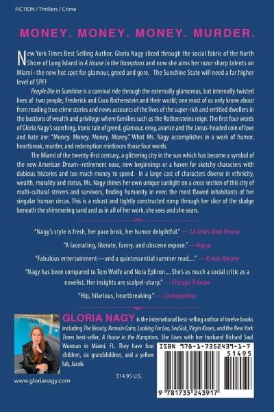 New York Times Best Selling Author, Gloria Nagy sliced through the social fabric of the North Shore of Long Island in A HOUSE IN THE HAMPTONS and now she aims her razor sharp talents on Miami--the new hot spot for glamour, greed and gore. The Sunshine State will need a far higher level of SPF! People Die in Sunshine is the carnival ride through the externally glamorous, but internally twisted lives of those two people, Frederick and Coco Rothenstein and their world; one most of us only know about from reading true crime stories and news accounts of the lives of the super-rich and entitled dwellers in the bastions of wealth and privilege where families such as the Rothensteins reign. The first four words of Gloria Nagy's scorching, ironic tale of greed, glamour, envy, avarice and the Janus headed coin of love and hate are: "Money. Money. Money. Money." What Ms. Nagy accomplishes in a work of humor, heartbreak, murder, and redemption reinforces those four words. A theme reflecting the world we have created that rises and falls with the same quite simple motivation that has driven every facet of human life since man stood upright. It is not the world we want to see, but it is the real world and where better to set a novel that is as much a social chronicle of our times as it is a gripping tale of the maze like search for a killer, than Miami. The Miami of the twenty-first century, a glittering city in the sun which has become a symbol of the new American Dream--retirement ease, new beginnings or a haven for sketchy characters with dubious histories and too much money to spend. In a large cast of characters diverse in ethnicity, wealth, morality and status, Ms. Nagy shines her own unique sunlight on a cross section of this city of multi-cultural strivers and survivors, finding humanity in even the most flawed inhabitants of her singular human circus. This is a robust and tightly constructed romp through her slice of the sludge beneath the shimmering sand and as in all of her work, she sees and she sears.