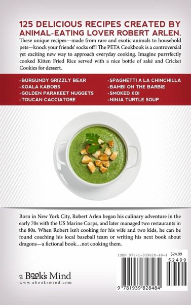 125 delicious recipes created by animal-eating lover Robert Arlen. These unique recipes-made from rare and exotic animals to household pets-knock your friends' socks off! The PETA Cookbook is a controversial yet exciting new way to approach everyday cooking. Imagine purrrfectly cooked Kitten Fried Rice served with a nice bottle of saké and Cricket Cookies for dessert. - Burgundy Grizzly Bear - Koala Kabobs - Golden Parakeet Nuggets - Toucan Cacciatore - Spaghetti à la Chinchilla - Bambi on the Barbie - Smoked Koi - Ninja Turtle Soup Born in New York City, Robert Arlen began his culinary adventure in the early 70s with the US Marine Corps, and later managed two restaurants in the 80s. When Robert isn't cooking for his wife and two kids, he can be found coaching his local baseball team or writing his next book about dragons-a fictional book...not cooking them.