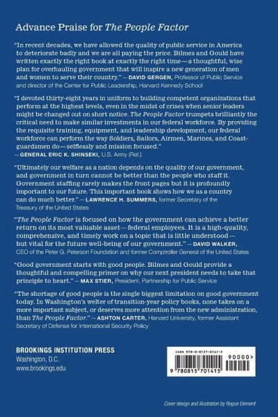 " Successful businesses have spent the past two decades retooling and rethinking how to manage their people better. Most big companies that have survived and prospered in the 21st century view employees as a vital strategic asset. In comparison, the U.S. federal government is a Stone Age relic, with its top-down bureaucracy, stovepiping of labor and responsibilities, and lack of training and investment in its own public servants. The inevitable result is a government not keeping up with the complex demands placed on it. In T he People Factor, Linda Bilmes and Scott Gould present a blueprint for reinvigorating the public sector in order to deliver results for America. Their premise is that the federal government can achieve the same gains as the best private sector and military organizations by managing its people better. Their new vision for public service is based on ""The People Factor,"" a set of management tools drawn from best practices in successful companies, the military, and high-performing government agencies. Part One of The People Factor book shows why the U.S. personnel system needs reform, revealing the high price of inaction. Part Two lays out the specific steps that must be taken to achieve the necessary gains. Part Three focuses on how to implement the People Factor and make the authors' vision a reality. They argue that the next president needs to turn this issue into a top priority and use political capital to push reform. Highlights of the book include: . Extensive original survey research . Case studies from government and the military . Interviews with leading thinkers on strategic human capital . A number of specific proposed innovations . A detailed proposal for a nationwide effort to train and revitalize the public service"