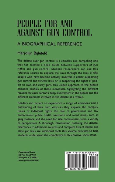 The debate over gun control is a complex and compelling one that has created a deep divide between gun rights and gun control supporters. Student researchers can use this reference source to explore the issue through the lives of fifty people who have become actively involved in either supporting gun control and stricter laws, or in supporting the rights of people to own and carry guns. This unique approach to the debate provides profiles of these individuals, highlighting the different reasons for each person's deep involvement in the debate and the different elements involved in the debate as a whole. Victims of gun violence, police officers, physicians, and Second Amendment scholars are among those who put a human face on this complicated debate. Readers can expect to experience a range of emotions and a questioning of their own views as they explore the complex issues of individual rights, the role of government and law enforcement, public health questions, and social issues such as gang violence and the need for safe communities from a variety of perspectives. A thorough introduction outlining the debate, references to additional sources, and complete lists of federal and state gun laws are additional tools this volume provides to help students understand the complexity of this divisive social issue.