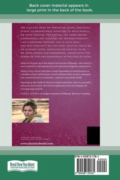 The eighties were my formative years, and while other teenagers were gyrating to rock 'n' roll, we were praying for revival. We were taking communion, not cocaine. We treated virginity like a wedding present, not a cold sore. And why wouldn't we? We were told we could be, we already were, anything we wanted to beâ¿¿ We were armed and dangerous. Armed with the power of God and dangerous in the eyes of Satan. Tanya Levin grew up in the church that became Hillsong - the country's most ambitious, entrepreneurial and influential religious corporation. People in Glass Houses tells how a small Assemblies of God church in a suburban school hall became a multi - million dollar tax - free enterprise and a powerful force in Australia today. Opening up the world of Christian fundamentalism, this is a powerful, personal and at times very funny exploration of an all - singing, all - swaying mega church.