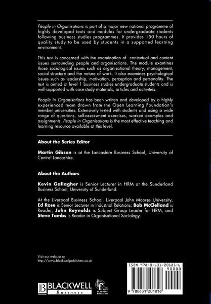 People in Organisations is concerned with the examination of contextual and content issues surrounding people and organisations. The module examines those sociological issues such as organisational theory, management, social structure and the nature of work. It also examines psychological issues such as leadership, motivation, perception and personality. The text is aimed at Level 1 business studies undergraduate students and is well supported with case study materials, articles and activities.
