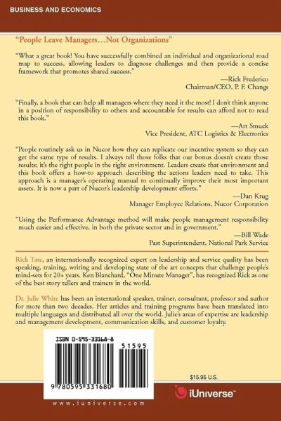 The Performance Advantage(TM) provides managers at every level with the ability to understand how to take the right action, at the right time, to increase performance and create a motivational work environment. For years, the myth of traditional thinking was that creating high morale resulted in high performance. Think again! Arthors Rick Tate and Dr. Julie White destroy this myth and provide managers practical, applied methods, skills, and concepts that come directly from over 30 years of research in organizational effectiveness, not from some new management "flavor of the month." With a concise, easy to remember model, managers will be energized to lead more effectively, with fewer resources and within tighter budgets. Imagine what it will be like to take action...the right action, at the right time to get bottom line results! The Performance Advantage Method(TM) focuses on the manager's role and actions to impact: - Employee Motivation - Performance Expectations - Employee Ability - Employee Attitude - Confidence - Desire and Motivation - Organizational Issues - Personal Issues - Meaningful Participation - Leadership Action: When the leader's action is aligned with the follower's performance results and attitude (rather than the leader's comfort zone), then performance, retention, and relationships all improve.
