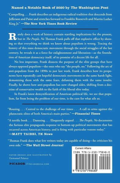 From the prophetic author of the now-classic What's the Matter with Kansas? and Listen, Liberal, an eye-opening account of populism, the most important-and misunderstood-movement of our time. Rarely does a work of history contain startling implications for the present, but in The People, No Thomas Frank pulls off that explosive effect by showing us that everything we think we know about populism is wrong. Today "populism" is seen as a frightening thing, a term pundits use to describe the racist philosophy of Donald Trump and European extremists. But this is a mistake. The real story of populism is an account of enlightenment and liberation; it is the story of American democracy itself, of its ever-widening promise of a decent life for all. Taking us from the tumultuous 1890s, when the radical left-wing Populist Party-the biggest mass movement in American history-fought Gilded Age plutocrats to the reformers' great triumphs under Franklin Roosevelt and Harry Truman, Frank reminds us how much we owe to the populist ethos. Frank also shows that elitist groups have reliably detested populism, lashing out at working-class concerns. The anti-populist vituperations by the Washington centrists of today are only the latest expression. Frank pummels the elites, revisits the movement's provocative politics, and declares true populism to be the language of promise and optimism. The People, No is a ringing affirmation of a movement that, Frank shows us, is not the problem of our times, but the solution for what ails us.