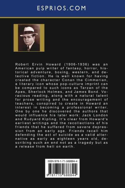 Robert Ervin Howard (1906-1936) was an American pulp writer of fantasy, horror, historical adventure, boxing, western, and detective fiction. He is well known for having created the character Conan the Cimmerian, a literary icon whose pop-culture imprint can be compared to such icons as Tarzan of the Apes, Sherlock Holmes, and James Bond. Voracious reading, along with a natural talent for prose writing and the encouragement of teachers, conspired to create in Howard an interest in becoming a professional writer. One by one he discovered the authors that would influence his later work: Jack London and Rudyard Kipling. It's clear from Howard's earliest writings and the recollections of his friends that he suffered from severe depression from an early age. Friends recall him defending the act of suicide as a valid alternative as early as eighteen years old, describing such an end not as a tragedy but as a release from hell on earth.