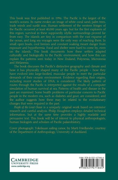 Human settlement of the western fringes of the Pacific began at least 40,000 years ago. Long, hazardous sea voyages were the only way of reaching the tiny islands scattered through this vast expanse of ocean. Food and shelter were hard to come by, even on land. This book documents how these settlers adapted culturally and biologically to the distinctive Pacific environment, and how they evolved into the large-bodied, muscular people seen today in New Zealand, Polynesia, Micronesia and Melanesia. Philip Houghton considers recent studies of DNA, patterns of health and disease, and computer simulations of human survival at sea based on the likely routes through the Pacific. People of the Great Ocean is a unique work based on extensive research and careful analysis. Philip Houghton's text presents detailed technical information, but remains highly readable and persuasive.